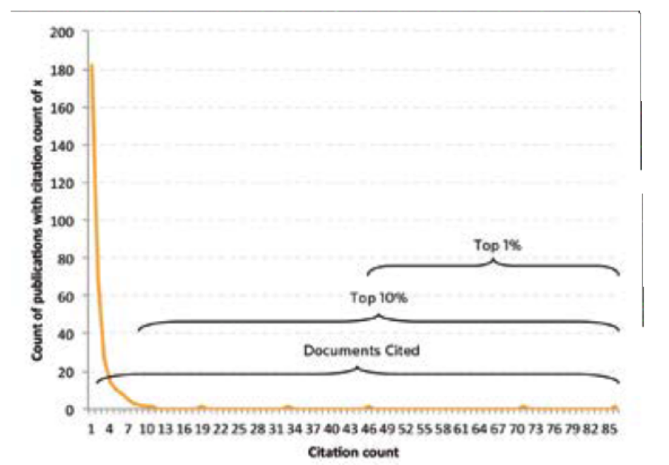 ちなみにH-Indexを10とるためには、被引用数が10の論文を10本書く必要があります。被引用数が10というのは下記グラフから上位10%の論文である必要があると言うことです。これからもH-Index10の価値がどれくらいかと言うことが想像できます。